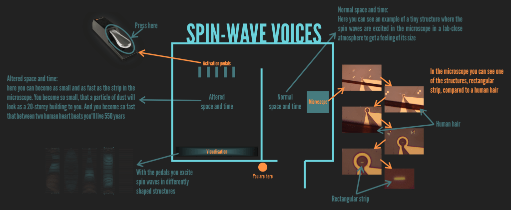 With a simple pedal activation, it is possible to start an excitation of spin waves in one or several of various microstructures of differently shaped tiny pieces. The data visualized and sonified at the exhibit is a result of micromagnetic simulations of a real physical system, which were confirmed by the measurements (so it is happening like that in real life) for one of the shapes. The pedal activation starts the process of pushing the system with periodic uniform magnetic field. By keeping the pedals pressed for longer time visitors can see how spin waves get excited and evolve with time and that for different shapes very different patterns of spin waves are formed. What is interesting is that for the exhibit from the physics point of view everything was set the same for all 5 structures, even thickness, only their lateral shape was differed, meaning that the difference in patterns for different shapes is purely an art of those shapes, so to say.